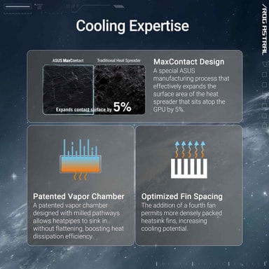 ROG Astral uppgraderar kylningen med en layout med fyra fläktar, vilket ökar lufttrycket med 20%. Det har ett patenterat ångkammare med frästa kanaler för att förbättra värmeöverföringen med 10%, plus en fasförändrande värmekudde som smälter under belastning för att säkerställa att GPU:n hålls optimalt kyld.