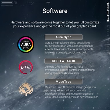 ROG Astral använder GPU Tweak III för precisionsjustering, Power Detector+ för att övervaka kabelhälsa och MuseTree för AI-bildgenerering.