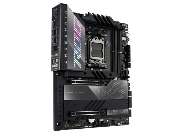 AMD X670 ATX motherboard with 18+2 power stages, DDR5 support, five M.2 slots, USB 3.2 Gen 2x2 front-panel connector with Quick Charge 4+ support, dual USB4®, PCIe® 5.0, onboard Wi-Fi 6E and Aura Sync RGB lighting