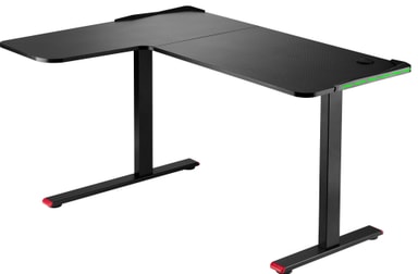 Piranha L-shaped RGB skrivbord för gamingpassar enkelt in i alla hörn och ger tillräckligt med utrymme för din spelutrustning och tillbehör tack varedess L-form. Skrivbordet har en ram i helmetall samt dubbel RGB -belysning så du kan matcha det med resten av din utrustning. Den har även kolfiberyta och en ktok för hörlurar.