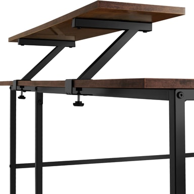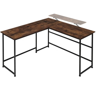 Den enkla, medvetet stilrena designen på skrivbordet Melrose från Tectake, i klassisk industriell stil, är perfekt för både fokuserat och kreativt arbete. Den praktiska hörnkonstruktionen, det flexibla bildskärmsfästet och det generösa benutrymmet bidrar alla till den behagliga atmosfären hos denna lättskötta kontorsmöbel. 6 höjdjusterbara fötter kompenserar för ojämna golv och säkerställer en stabil och stadig grund. Den minimalistiska designen kompletteras visuellt av den eleganta träådringen i varm trälook och den stiliga ramen i svart stål, vilket skapar en tilltalande kontrast.