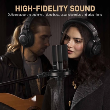 Maono MH700-headsetet är en sluten over-ear-monitorhörlur med stora 50 mm-element för exakt studioljud och bättre bullerisolering. De erbjuder komfort för långa sessioner, 180° roterande öronkåpor och dubbla 3,5 mm/6,35 mm löstagbara ingångar för universell kompatibilitet med studio- och konsumentutrustning.