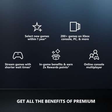 *Rewards: Terms apply. Microsoft Account required. Select markets only. Rewards vary by Xbox Game Pass Plan and Rewards Level. Point values vary by local market currency, Rewards level and the number of points redeemed. Point multipliers compared to Game Pass Essential earning potential. Gameplay rewards for 18+. Exclusive quests with Premium and Ultimate plans only, for titles in the Xbox Game Pass library. Excludes PC Games that require 3rd party launchers or are played on Battle.net. Playtime required for all quests. Qualifying purchases at Microsoft Store (online, or on Windows or console) at Rewards with Xbox. *Value with Xbox Game Pass Ultimate includes 20% off the purchase price of select titles in the Xbox Game Pass library, plus 10% of purchase price back in Rewards points, plus up to 4% of the purchase price depending on Rewards Level.
