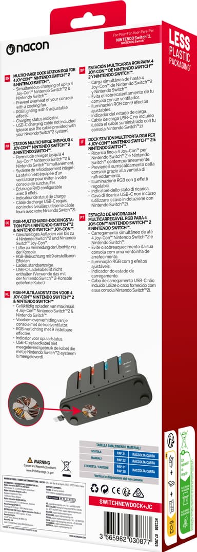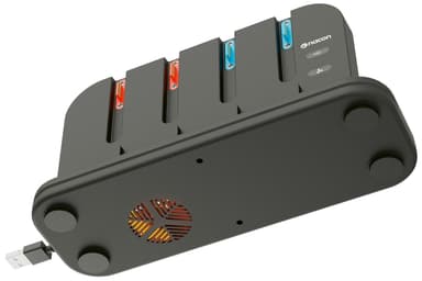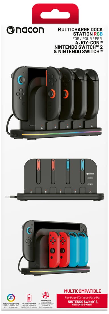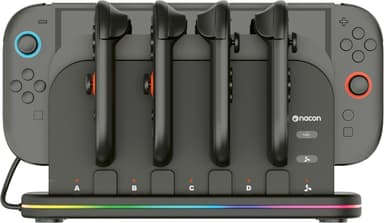 Nacon Switch 2 och kontroller-laddningsdocka låter dig ladda din Nintendo Switch eller Switch 2 samtidigt som upp till fyra JoyCon-kontroller. Den är utrustad med RGB-belysning, konsolkylfläkt och USB-strömkoppling för snabb laddning.Läs mer om produkten