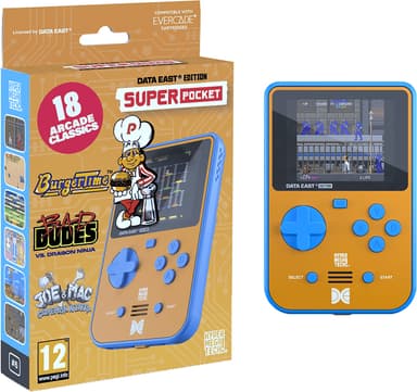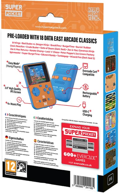 Ta med dina favoritspel överallt med den bärbara spelkonsolen HyperMegaTech Data East Super Pocket. Med 18 arkadspel och över 4 timmars batteritid. Den har även ett 3,5mm-uttag för att ansluta hörlurar.Läs mer om produkten
