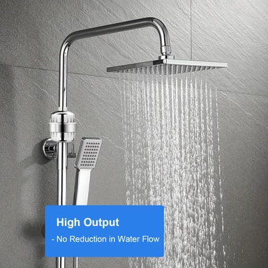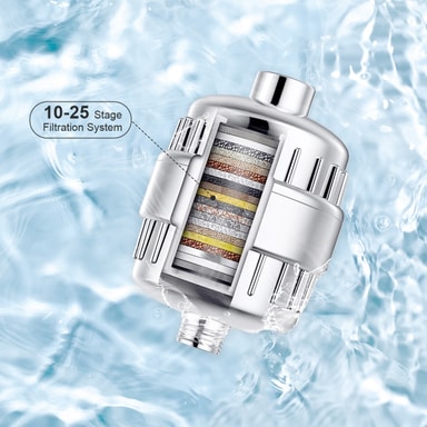 Avancerad filtrering: Detta duschfilter använder ett filtreringssystem med 10-25 lager för att effektivt minska klor, tungmetaller och andra föroreningar från ditt duschvatten, vilket ger dig en renare och mer hälsosam duschupplevelse.