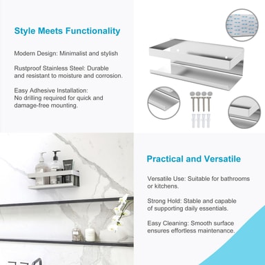 Hyllan är rostfri och lätt att rengöra, och den passar för många duschtillbehör, t.ex. tvål, schampo, duschgel, rakhyvlar och mycket mer.