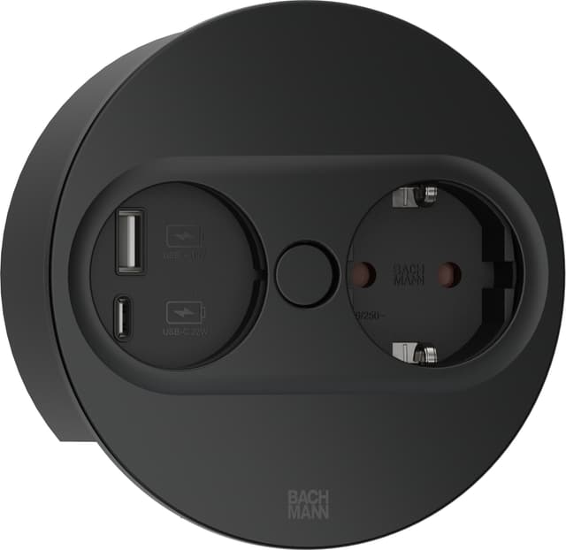 Bachmann TWIST 2 eluttag med 22W-uttag öppnas med en knapptryckning. Utrustad med 1x CEE7/3 230V, 1x USB A/C-laddare (22W), allt i en stilren mattsvart finish.Läs mer om produkten