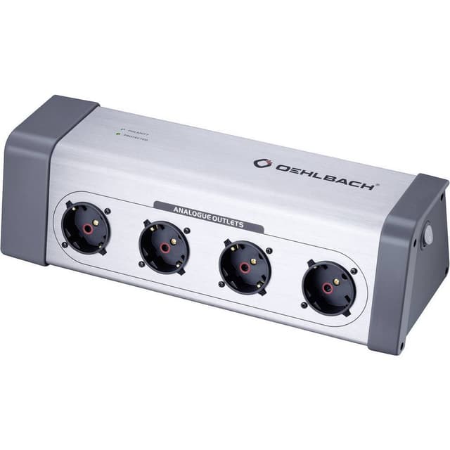 Powersocket 908 från Oehlbach är ett perfekt utformat multipelt grenuttag som är något alldeles extra och motsvarar kraven för de mest krävande tillämpningarna. Detta grenuttag har totalt åtta individuella uttag, bestående av fyra digitala (filtrerade) och fyra analoga (ofiltrerade) uttag. För att garantera en fasriktig anslutning av apparater, har Powersocket 908 fasmarkeringar på de enskilda uttagen. Rätt anslutning visas med en röd kontrollampa. Endast på så sätt kan potentialutjämningsströmmar, som har en negativ påverkan på bild- och ljudinformationen, undvikas effektivt. Ett inre ledartvärsnitt på 3,3 mm² bestående av extra ren, syrefri koppar ger ett inre kablage i högsta klass, som garanterar en stabil strömförsörjning i alla situationer - även för komponenter med högt effektbehov.