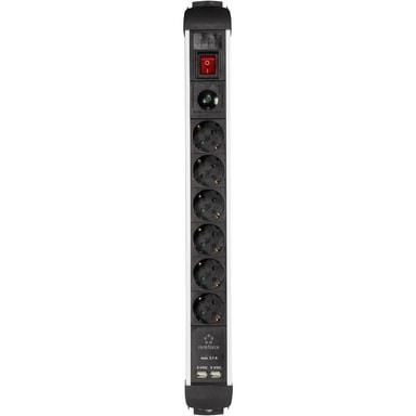 Utrustad med belyst strömbrytare, överspänningsskydd och 2x USB-uttag (5 VDC, total ström: 2,1 A). Listen kan skruvas fast.