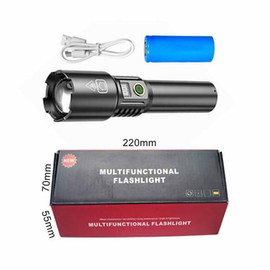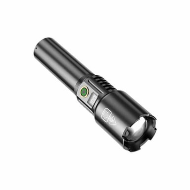 Uppladdningsbar och Portabel Design: Denna LED-ficklampa har en praktisk uppladdningsbar design, som drivs av ett 26650 3000mAh batteri, vilket sparar pengar på engångsbatterier. Den medföljande USB-kabeln möjliggör enkel laddning från olika strömkällor, som powerbanks, bärbara datorer och väggadaptrar. Dess kompakta och lätta aluminiumlegeringskonstruktion gör den lätt att bära i ryggsäcken, handskfacket eller verktygslådan. Den integrerade USB-strömuttagsporten gör den också användbar som en powerbank, vilket gör att du kan ladda dina mobila enheter i nödsituationer. Denna ficklampas portabilitet och uppladdningsmöjligheter gör den till ett pålitligt verktyg för alla äventyr eller nödsituationer.