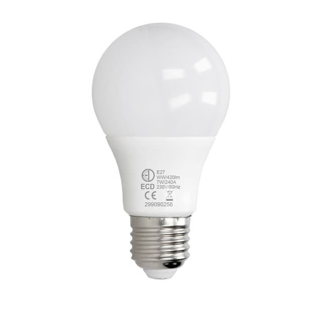 Omfattning av leverans: 10 x 7W E27 LED-lampa varm vit Teknisk information: Märke / Modell: E27 LED-lampa Energieffektivitetsklass: A + Ljusstyrka: 420 lumen Konsumtionen i Watts: 7 W Vinkel: 270 ° Livet i timmar: 50.000 h .Färg: Var