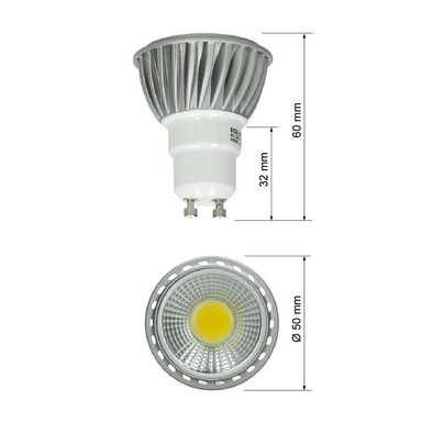 Omfattning av leverans: 1 x LED-lampa kall vit COB Teknisk information Modell: kall vit GU10 6W GU10 Vinkel: 60 ° Strömförbrukning: 6W (6W LED motsvarar 30W halogen) Driftspänning: 220 - 240 V AC Färgtemperatur: kall vit 6000 K Ljuss