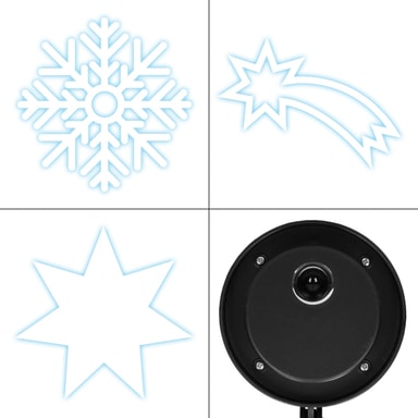 De dekorativa strålkastarna från ECD Germany projicerar 3 olika motiv (stjärnstjärna, iskristall och stjärna) vid jul, nyårsafton eller som festdekorationer på husväggar och alla andra ytor - de särskilt ljusa och energibesparande LED-lamporna ger ett lysande resultat. De 3 motivlamporna är anslutna till varandra med en kabel så att du bara behöver ett uttag. De förankras snabbt och enkelt i marken med hjälp av en spik och är naturligtvis också skyddade mot stänkande vatten.