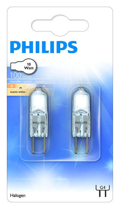 Philips halogenlampa 8727900203073 är dimbar och avger ett intensivt och grinstrande vitt ljus. Använder G4 sockel.