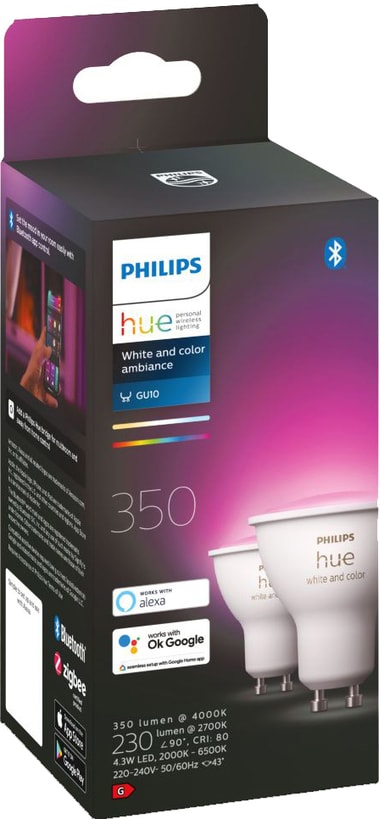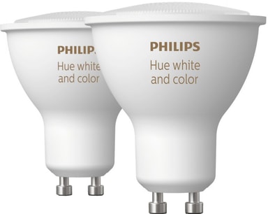Philips Hue White and Color Ambiance 4.3W GU10 2st ger ditt hem en fantastisk belysning. Med 16 miljoner färger och olika nyanser av vitt ljus kan du skapa vilken stämning du vill.Läs mer om produkten