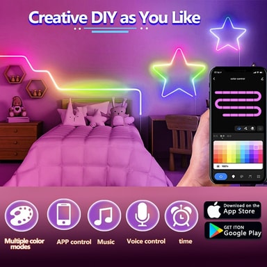 Immersiv musiksynkronisering: Förvandla ditt utrymme med vår Bluetooth-musik neon LED-strip. Den inbyggda mikrofonen gör att lamporna kan synkroniseras med dina favoritlåtar och skapa en dynamisk och uppslukande audiovisuell upplevelse. Perfekt för fester, speluppsättningar eller bara för att koppla av hemma, pulserar lamporna och ändrar färg i takt med musiken, vilket förstärker atmosfären och ger din underhållning liv. Njut av en levande och personlig ljusdisplay som reagerar på varje beat och melodi, vilket gör varje ögonblick mer minnesvärt. Den sömlösa integrationen med Bluetooth säkerställer enkel anslutning och kontroll från din smartphone eller surfplatta.