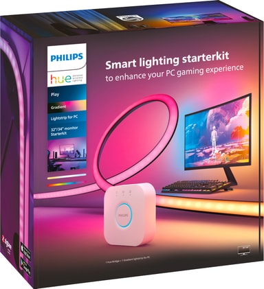 Philips Hue Play Gradient PC ljusremsa 32/24 tum startkit följer vad som händer på din PC-skärm för att skapa en mer uppslukande datorupplevelse. Fäst bara ljusremsan på baksidan av bildskärmen, koppla ihop den med Hue Sync-appen och upplev dämpning, dans och blinkande ljus.
