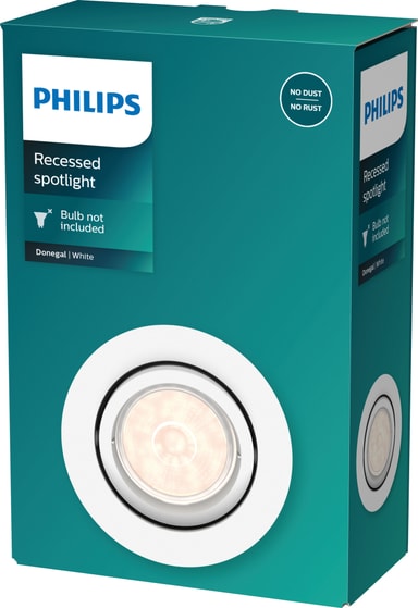Lys upp ditt rum med mångsidiga Philips Donegal taklampa GU10 som ger dig möjlighet att välja den glödlampa som passar ditt rums stil. Den infällda spotlighten med ett justerbart, lutningsbart spothuvud har en modern och elegant design. Tack vare kompatibiliteten med GU10-lampor kan du enkelt byta lampor och skapa den perfekta atmosfären i ditt rum, oavsett om du vill ha varmt, kallt, svagt eller mjukt ljus.