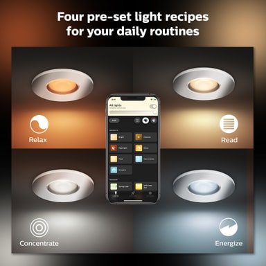 Designade för inomhusutrymmen som badrum använder dessa 4,2-watts spotlights en GU10-sockel. Som smarta lampor erbjuder de justerbara vita toner för att perfekt matcha din sinnesstämning eller tillfälle.