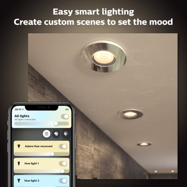 Förvandla ditt badrum med Philips Hue Adore infälld spotlight. Den har en justerbar 4,2-watts GU10-spotlight som erbjuder dimbart vitt ljus med olika färgtoner.Läs mer om produkten