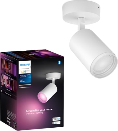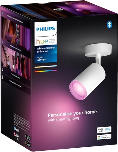 Philips Hue Fugato spotlight 4.2W GU10 erbjuder 16 miljoner färger och justerbara vita toner, så att du kan skapa rätt stämning för varje tillfälle. Styr den enkelt via Bluetooth eller med en Hue Bridge för fler funktioner. Det justerbara huvudet låter dig rikta ljuset dit du behöver det, vilket gör den till ett utmärkt val för alla inomhusutrymmen.
