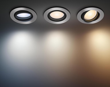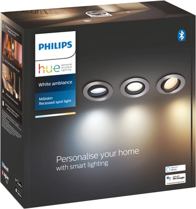 Philips Hue Milliskin infälld trippel spotlight 3x4,2W GU10 har ett justerbart infällt fäste för tak- eller vägginstallation, vilket ger fokuserad, dimbar belysning. Styr enkelt det varma till svala vita ljuset via Hue-appen för att skapa den perfekta atmosfären för alla tillfällen.