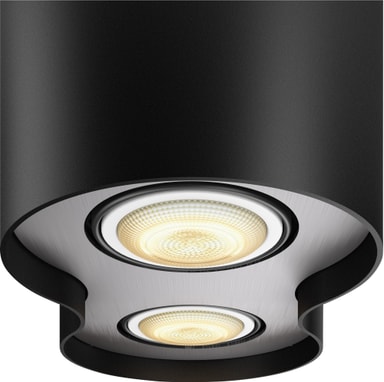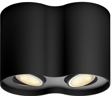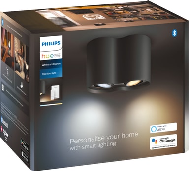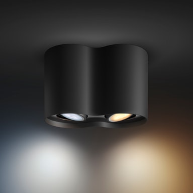 Philips Hue Pillarsvart spotlight-platta 2x5W med justerbara huvuden och slät minimalistisk design kommer passar snyggt in i alla moderna hem. Spotlighten har olika toner av varm till kall vit belysning, dimmerfunktion och du kan kontrollera belysningen med en Bluetooth-app eller den inkluderade dimmer-knappen. Om du vill låsa upp fler funktioner kan du para ihop spotlighten med Philips Hue-bryggan.