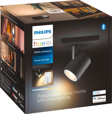 Med sitt flexibla huvud kastar Philips Hue Runner singelspotlight 4,2W GU10 ljus från varma till svala toner i varje hörn. Styr ljusstyrkan via Bluetooth/Hue Dimmer-omkopplare och förbättra dess kapacitet genom att ansluta till en Hue Bridge.Läs mer om produkten