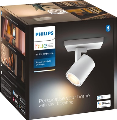 Med sitt flexibla huvud kastar Philips Hue Runner singelspotlight 4,2W GU10 ljus från varma till svala toner i varje hörn. Styr ljusstyrkan via Bluetooth/Hue Dimmer-omkopplare och förbättra dess kapacitet genom att ansluta till en Hue Bridge.Läs mer om produkten