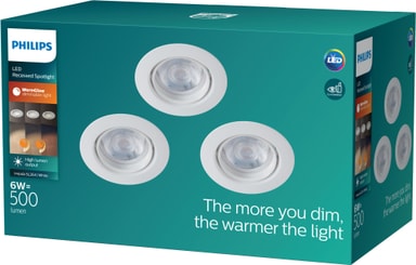 Tack vare Philips Impala taklampa 6 W 3-pack kan du lysa upp ditt hus eller din lägenhet med ett mysigt gult ljus. Den inbyggda taklampan kan dimmas samtidigt som den lyser med 500 lumen, vilket ger dig gott om ljus och skapar en mysig atmosfär. Lampan kan dimras från 2700 till 2200 Kelvin.