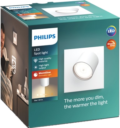 Med Philips Star spotbelysning med WarmGlow kan du smidigt dimra till rätt ljusnivå och ljuston – från starkt funktionellt ljus till ett mysigt varmt sken. Ju mer du dimrar ljuset, desto varmare blir det. Belysningen justeras via din befintliga dimmer. Denna armatur i vitt har fyra justerbara spothuvuden och är tillverkad i metall.