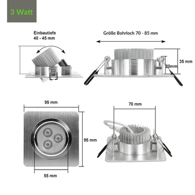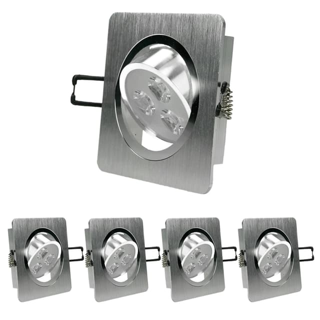 Omfattning av leverans: 5 x 3W Varm vita LED Infälld Ljus Teknisk information: Ljusstyrka: 220 lumen Motsvarar Halogen: 25W Effekt: 3W Klippa ut: 70 mm Djup: 38 mm Vikt: 134 g Dimensionerna hos lampan L x B: 92 x 92 mm Svängbara: 30