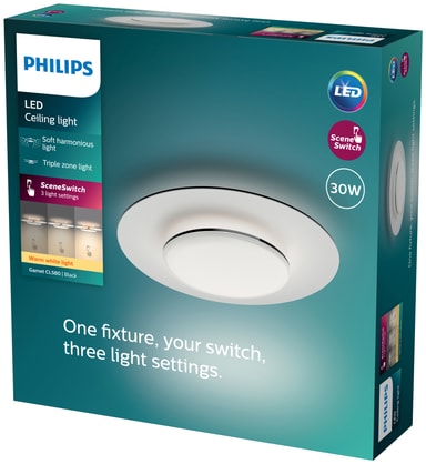 Philips Garnet taklampa 30 W har behagliga vitt ljus, SceneSwitch-inställningar och modern, minimalistisk design.Läs mer om produkten