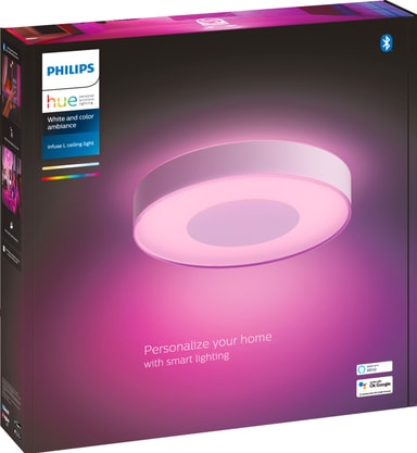 Philips Hue Infuse L vit taklampa kommer med RGB-färgspektrum och varmt till kallt vitt ljus för att fylla din interiör med atmosfäriskt och färgglatt ljus. Tack vare sin större storlek kommer den lätt att lysa upp rymliga rum, så att du kan skapa en färgstark atmosfär i ditt vardagsrum. Med Philips Hue-appen kan du njuta av enkel kontroll och för avancerade funktioner finns en Philips Hue-brygga som säljs separat.