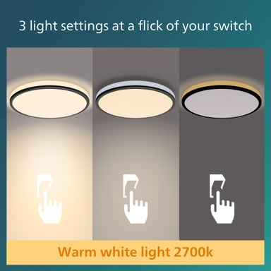 Denna eleganta Ozziet taklampa från Philips kombinerar ett huvudljus med ett subtilt linjärt kantljus, vilket gör att du kan njuta av unika ljuseffekter i ditt hem. Tack vare den integrerade SceneSwitch-funktionen kan du njuta av det kallvita ljuset i tre ljusstyrkeinställningar: 100%, 50% eller 20%. Detta är idealiskt när du inte redan har en dimmer installerad, eftersom du bara ändrar inställningen med din befintliga strömbrytare. Det inbyggda minneschippet kommer ihåg den senaste inställningen du använde. Denna armatur har en diameter på 30 cm.