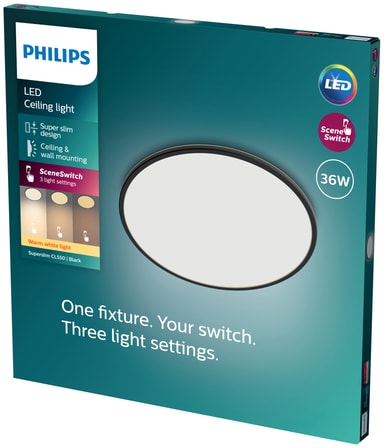 Philips SuperSlim taklampor är en serie superslanka och eleganta armaturer som ger högkvalitativ LED-belysning till alla utrymmen i ditt hem. Tack vare den integrerade SceneSwitch-funktionen kan du njuta av det varmvita ljuset i tre ljusstyrkeinställningar: 100%, 50% eller 10%. Detta är idealiskt när du inte redan har en dimmer installerad, eftersom du bara ändrar inställningen med din befintliga strömbrytare. Det inbyggda minneschippet kommer ihåg den senaste inställningen du använde. Denna armatur har en diameter på 55 cm och en svart finish.