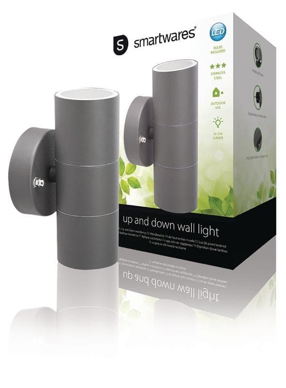 Smartwares GWL-176-HG Outdoor wall light - High quality stainless steel - Anthracite - Warm white light Illuminate your garden and front door with the Smartwares GWL-176-HG Outdoor wall light. The waterproof wall light is made of high quality stainless steel and has an IP44 protection rating. You can enjoy your illuminated garden thanks to the warm white light that shines both up and downwards. Designed with stainless steel The outdoor wall light suits almost every garden thanks to its design with high quality stainless steel. You can use the anthracite wall light with its light shining both up and downwards to give your garden or house a more modern look. The wall light is even more durable thanks to the two GU10 fittings with replaceable light source. Warm white light The included LED lights are 3 W and produce 230 Lumens, this can be compared with the light output of an incandescent light bulb with approximately 20 W. Besides, the light has a color temperature of 3000 K, which gives a warm white light. Easy to install You will not have to worry about mounting the light thanks to the easy mounting system that allows you to install the light in only a few steps. The outdoor light has an IP44 rating which means it is waterproof and it comes with an instruction manual and mounting materials.
