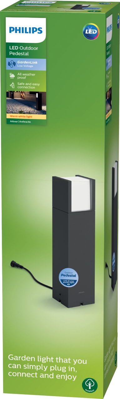 Tack vare Philips GardenLink LV Arbour piedestal utomhusbelysning 6 W kan du lysa upp din trädgård med ett varmvitt ljus. Lampan har en väderbeständig IP44-design och är enkel att installera tack vare vrid- och låskontakterna.Läs mer om produkten