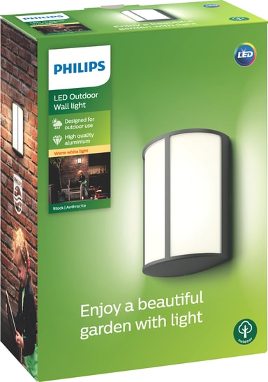 Philips Stock utomhusbelysning 5,5 W erbjuder en elegant belysningslösning. Den väggmonterade lampan har en elegant design och är väderskyddad enligt IP44, vilket gör den perfekt för riklig belysning av verandor, ytterväggar och trädgårdar.Läs mer om produkten