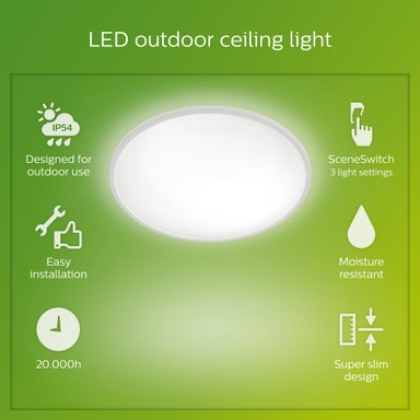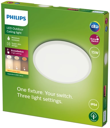 Philips SuperSlim taklampa för utomhusbruk 15 W med SuperSlim-design och click!FIX-montering passar perfekt i ditt tak, och du kan skapa rätt ljusstämning med SceneSwitch-tekniken, som gör att du kan välja mellan 3 olika ljusinställningar. Denna utomhuslampa har väderskyddsklass IP54.