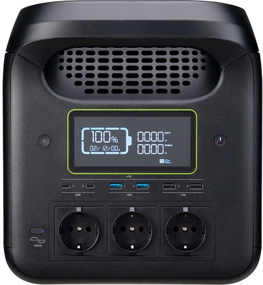 Med en 1800W-effekt kan denna powerstation driva 12 enheter samtidigt. Den har 3 AC-uttag, 4 USB-A-portar, 2 USB-C-portar, 1 biluttag och 2 DC 5521-utgångar – perfekt för allt från bärbara datorer till bilapparater.