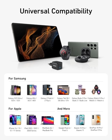 Anker 313 USB-C 45W Ace Laddare erbjuder ultra-snabb laddning med upp till 45 W, vilket gör att du kan ladda en Samsung Galaxy S23 Ultra fullt på mindre än en timme. Perfekt för att snabbt och säkert ladda dina enheter. Utrustad med 10 säkerhetsfunktioner, inklusive kortslutningsskydd, högspänningsskydd och temperaturkontroll, för att skydda dig och dina enheter.Specifikationer: