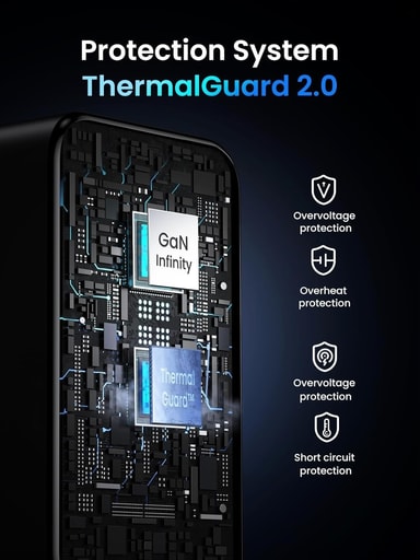 Produkten är utrustad med Thermal Guard 2.0 och GaN-teknologin vilket ger den en väldigt bra prestanda samt utmärkt skydd mot överspänning, kortslutning, överström och överhettning.