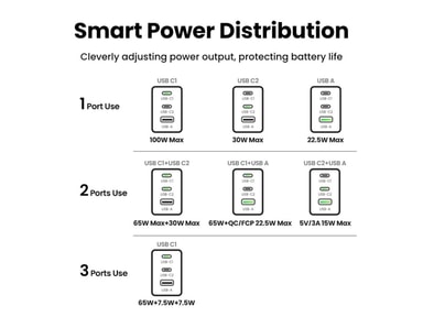 1 ports output: USB-C1 100W, USB-C2: 30W, USB-A 22,5W