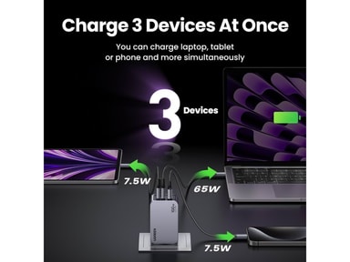 3 port output, USB-C1: PD 65W + USB-C2: 7.5W + USB-A: 7.5W