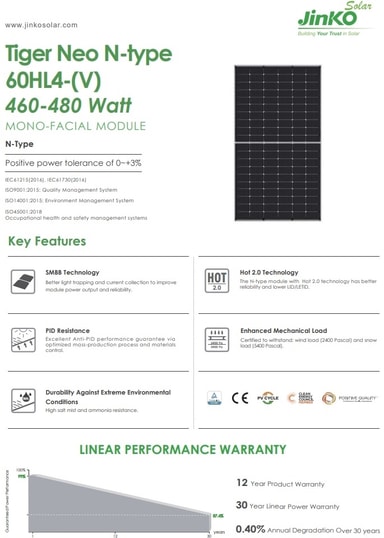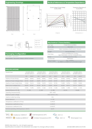 Specifikationer: * SMBB-teknik * 22,01 % Moduleffektivitet * Hot 2.0-teknik * 120 Monokristallina celler * PID-motstånd * Vindlast: 2400 Pascal, Snölast: 5400 Pascal (testlast) * Kontakt: Jinko JK03M2 - Designad för att passa Staübli MC4 Evo 2 Se länkarna nedan för detaljerad information