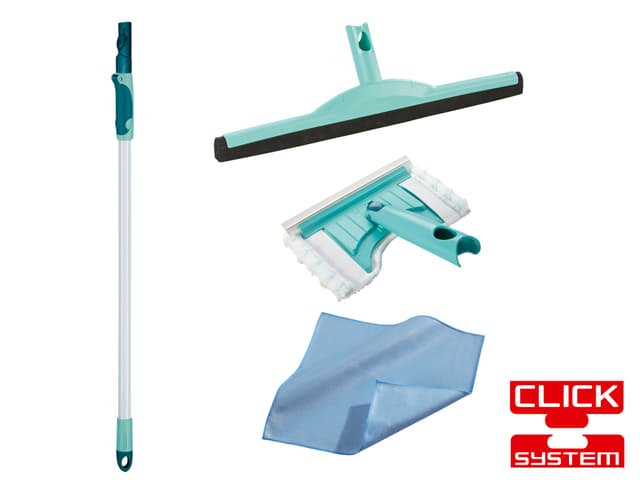 Click System-set för badrumsrengöring. Setet består av en 75-135 cm teleskopstång med metallskaft, en 45 cm bred mopp, en 22 cm 3-i-1-kakeltvätt och en Micro Magic mikrofiberduk 40 x 40 cm för allroundrengöring.Läs mer om produkten