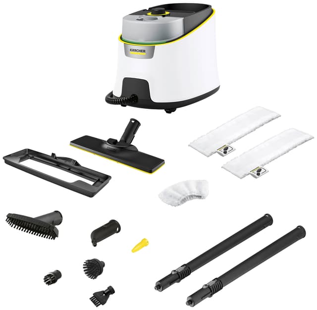 SC 4'sc levereras med ett förlängningsrör, en fogborste, en rundborste, ett handmunstycke med mikrofiberöverdrag, ett detaljmunstycke och en golvduk i mikrofiber med kardborreband som smidigt förvaras i det integrerade tillbehörsfacket.
