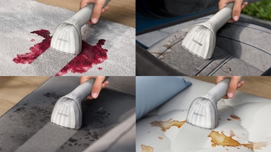 Mattrengöraren innehåller flera tillbehör för enklare rengöring: ett 90 cm 3-i-1 munstycke, ett 150 cm brett munstycke och Philips fläckborttagningsmedel.